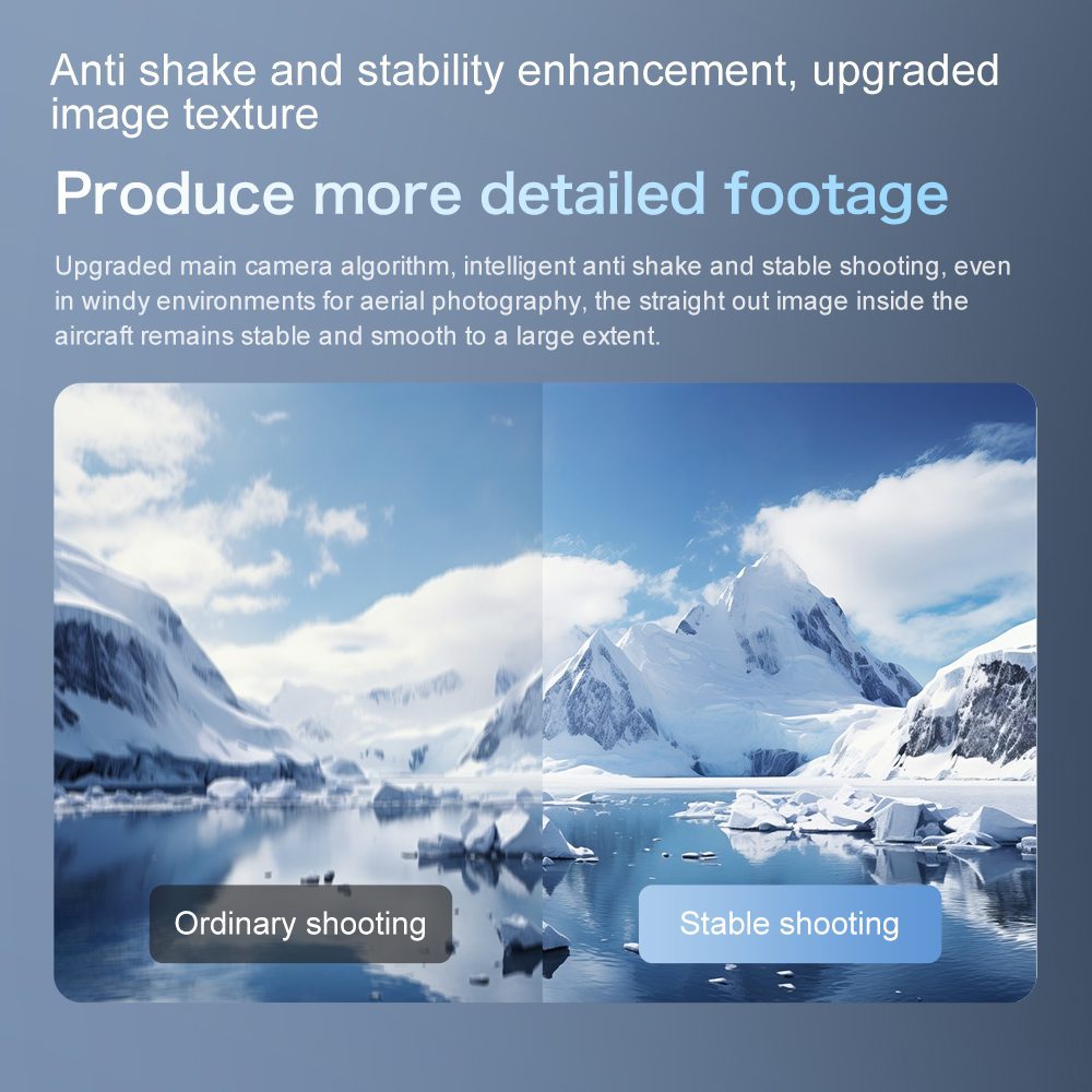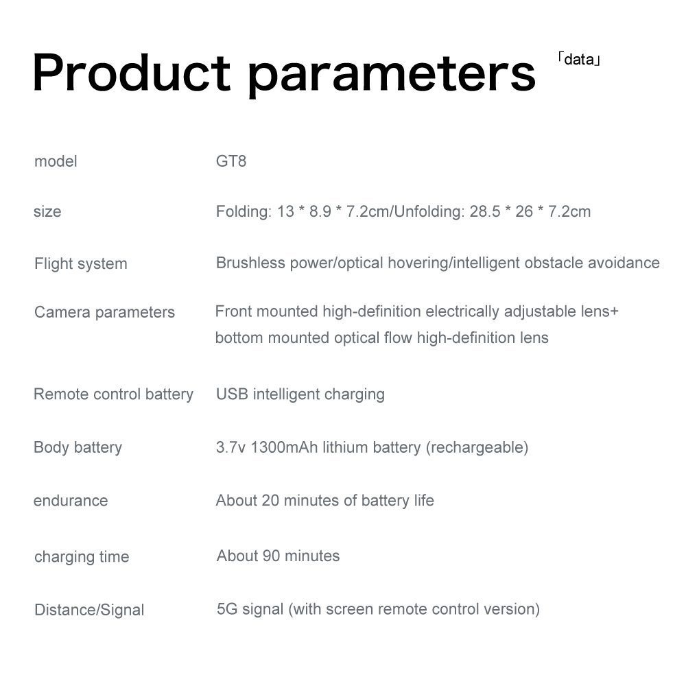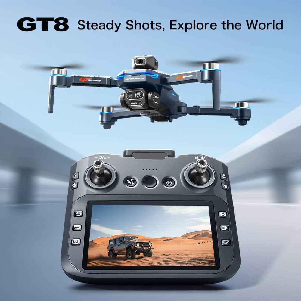 Die GT8-Drohne verfügt über einen 4,3-Zoll-Fernbildschirm, der das Benutzererlebnis durch sein fortschrittliches Objektivdesign verbessert, das eine erhöhte Stabilität und EIS (Electronic Image Stabilization) für klarere Fotos bietet. Dieses Modell ist mit einem Höhenhaltemodus und einer optischen Flusspositionierung ausgestattet, die eine stabile Flugleistung gewährleisten. Darüber hinaus verfügt die Drohne über eine praktische LCD-Leistungsanzeige am Gehäuse und ermöglicht es Benutzern, Flugrouten anzupassen, indem sie die gewünschten Wege direkt in der zugehörigen App zeichnen.