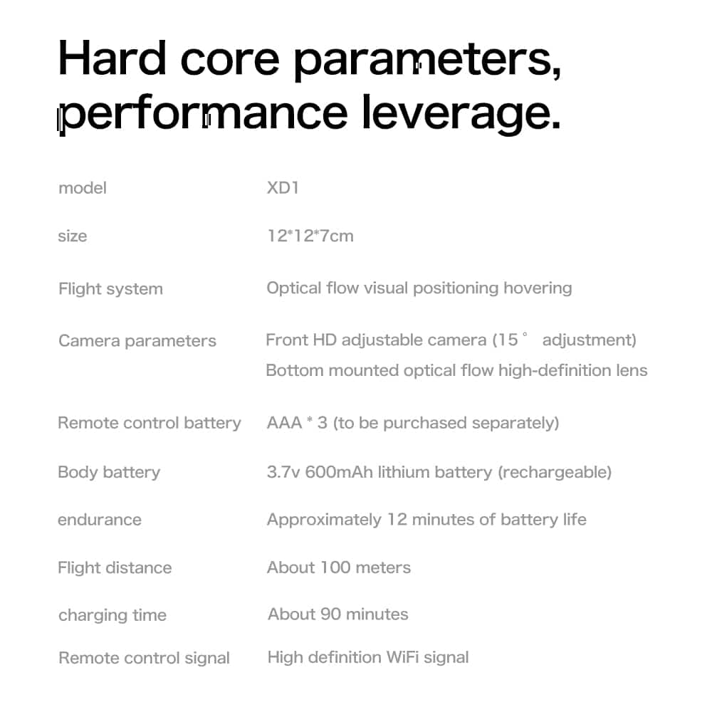Die XD1 ist eine kompakte und robuste Mini-Drohne aus Aluminiumlegierung, die auf Tragbarkeit und stabilen Flug ausgelegt ist. Ihr optisches Positionierungssystem sorgt für präzises Schweben und gleichmäßige Höhenhaltung und eignet sich ideal für den Einsatz in Innenräumen oder ruhigen Außenbereichen. Der integrierte Headless-Modus vereinfacht die Bedienung, da keine manuelle Ausrichtung mehr erforderlich ist. Dank ihres robusten Aluminiumrahmens ist sie besonders widerstandsfähig gegen Stöße und Stürze. Mit ihrer integrierten HD-Kamera können Nutzer mühelos klare Luftaufnahmen und Videos aufnehmen. Durch ihre Widerstandsfähigkeit, intuitive Steuerung und zuverlässige Leistung ist sie eine hervorragende Einsteiger-Drohne für Anfänger und Gelegenheitspiloten.
