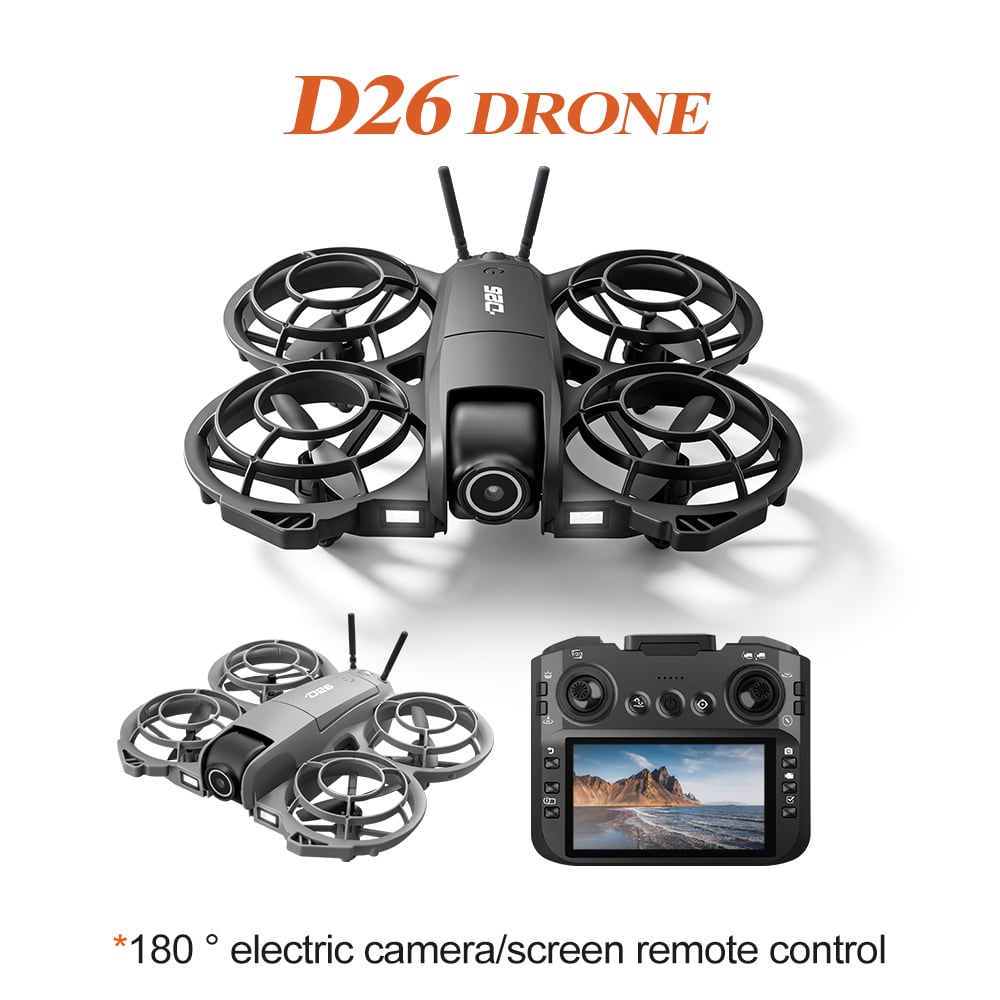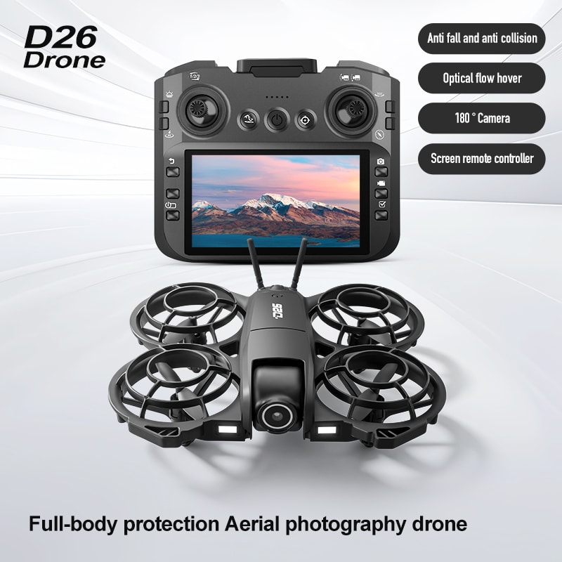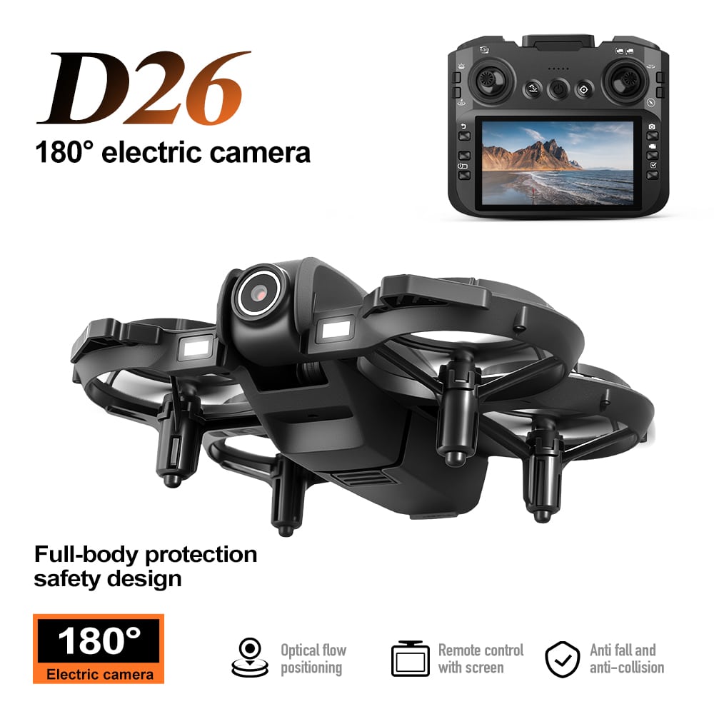 The D26 mini drone features a fully enclosed propeller design for safety, and a compact mini body for easy portability. It supports altitude hold, three‑way obstacle avoidance, and a 180° electronically adjustable camera for upward, level, and low‑angle shots. Optical flow positioning ensures stable flight. Headless mode, one‑key return, and app‑drawn flight paths enable autonomous flying. Equipped with 4K/6K/8K HD camera, WiFi FPV, 2.4GHz anti‑interference, 4‑channel control (ascend/descend/forward/back/left/right/roll), 360° flips, and a 6‑axis gyro for smooth, responsive flight.